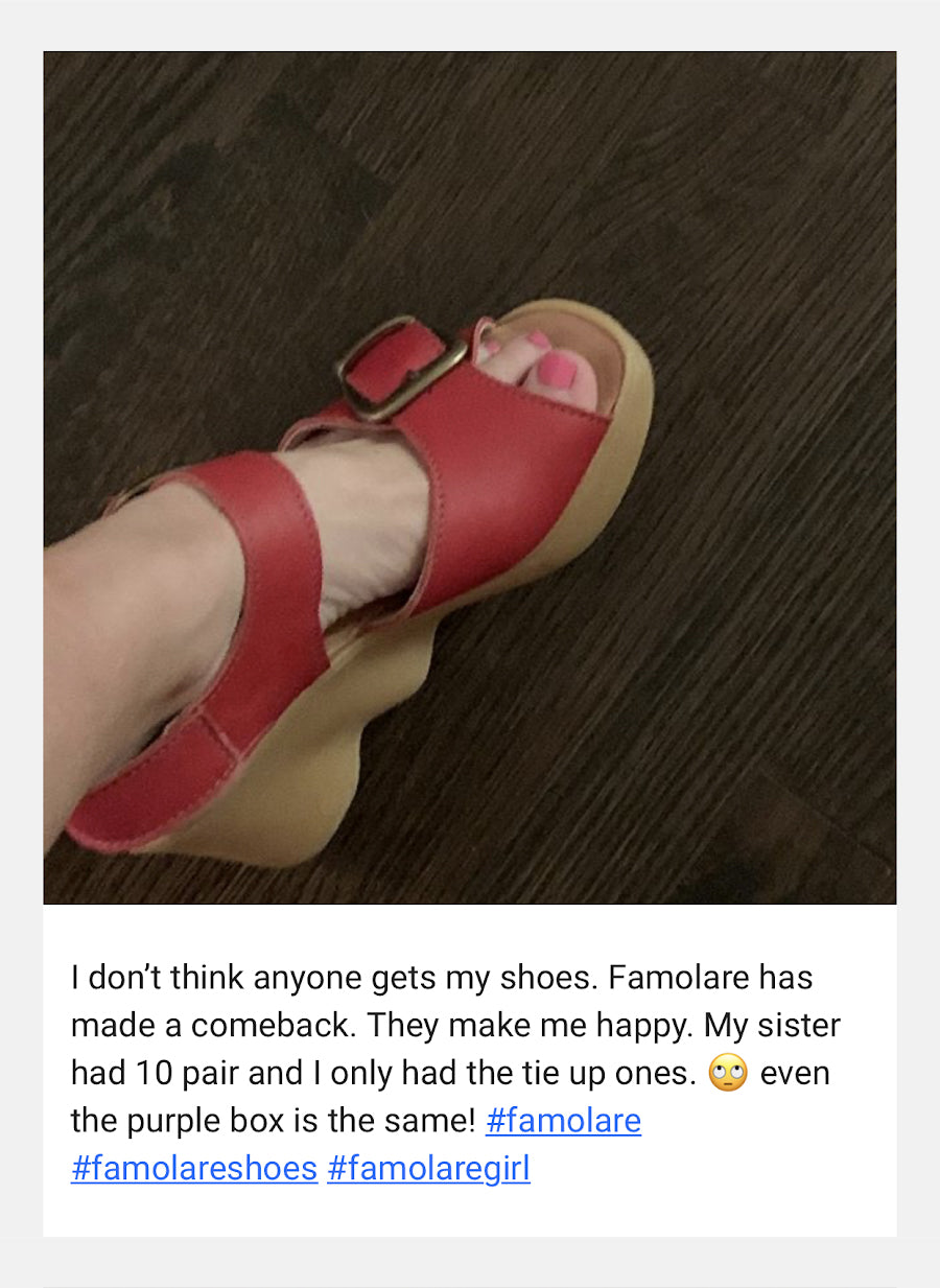 “I am a “Famolare” myself! I started wearing these beautiful sandals in the 70s during high school & college while walking miles every day in them without discomfort. I recently rediscovered this beautiful wave action wedge & fell in love all over again. Those feelings of “oh so comfortable.” The sense of perfect posture; my entire body aligned, the feeling of taller legs and a perfect stride. I noticed my hip flexors were a little sore after pacing back and forth while my husband was having a surgical procedure. I say that is a good thing showing how this wave really benefits your entire body. While I watched other women looking at my Cross Your Heart Famolares, another feeling came rushing back. I was a confident, secure woman, feeling younger with more energy & vitality. I was literally glowing from within knowing that these other women were not only admiring my Famolares but they were in awe of me. Wow, what a rush!”